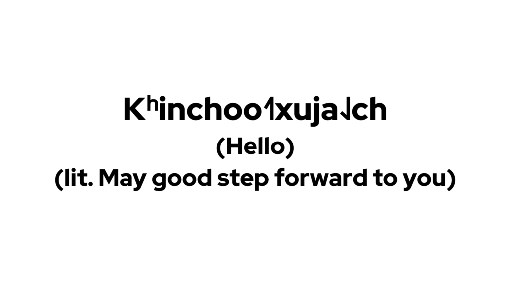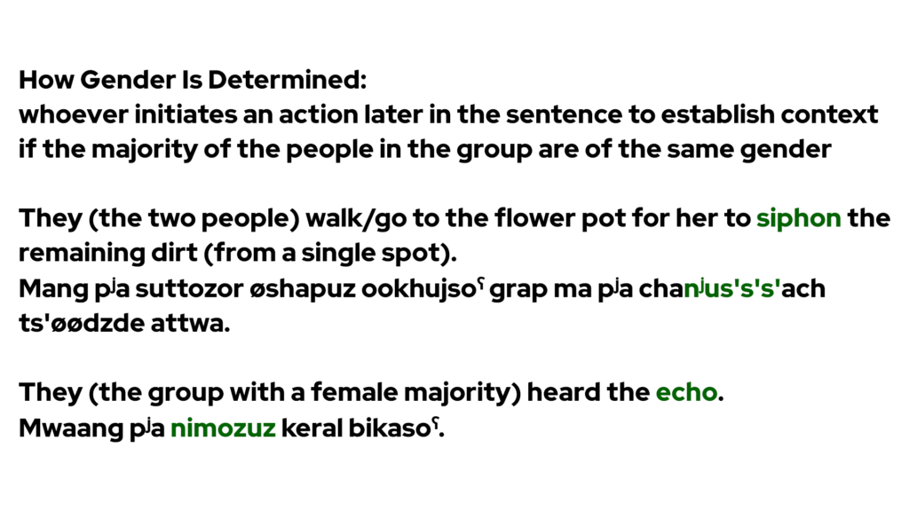 It has a simple labial consonant system, since it only uses the voiceless plosive labial (p) and the voiced nasal labial (m). Of course, they are modified by either palatalization or labialization. The voiceless dental plosive (t) and the voiceless alveolar plosive (ts) are used a lot, including being the only consonants that can be ejective. There is a more universal usage of the aspirated geminates, but that’s for later in the video.
