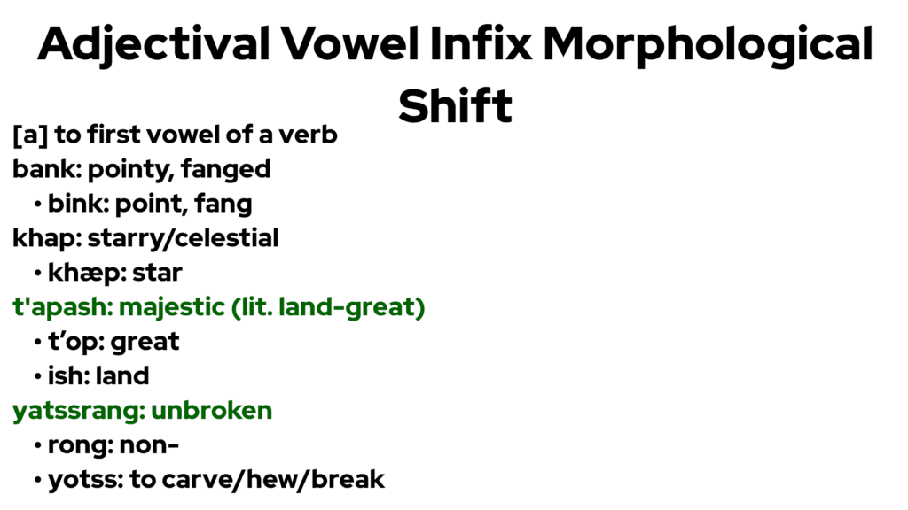 In order to create adjectives, the language uses an infixed vowel morphological shift. Typically, it involves taking any word and infixing the open central vowel (a) in the first vowel of a word, whether noun or verb, to form an adjective. I differentiate between adjectives and genitives in the sense that genitive words imply a possession of an object word, while adjectives describe the essence of the object word.