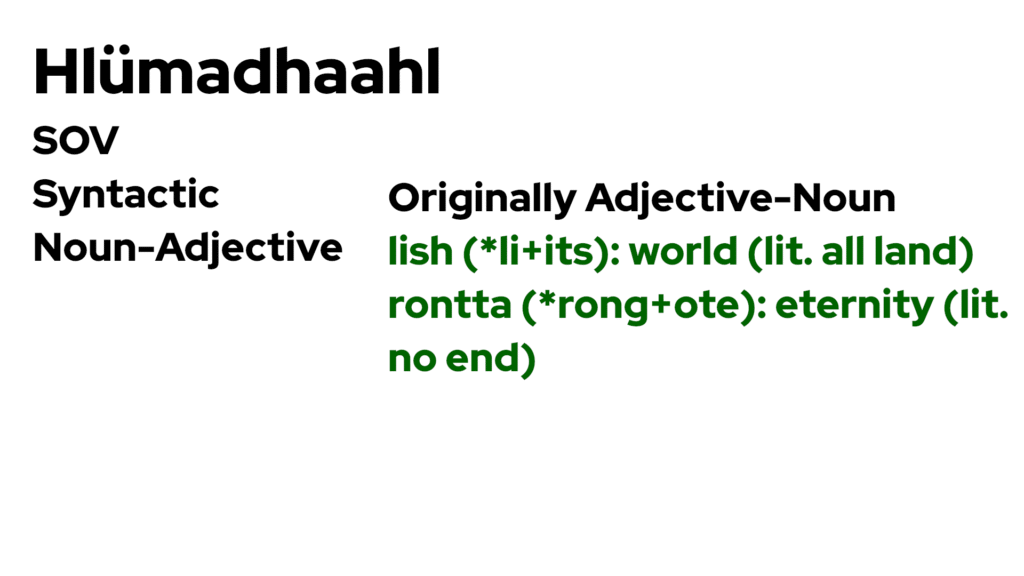 Hlümadhaahl is an SOV Syntactic language, where the adjectives come after the nouns they modify. Of course, the protolanguage behind Hlümadhaahl was originally Adjective-Noun, meaning some of the words in the lexicon reflect this fact.