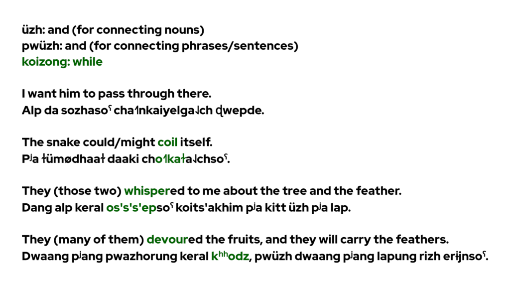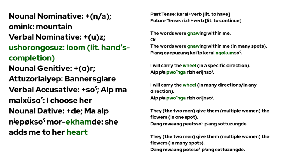 Through the Pareto Principle and Morris Swadesh’s list of basic English words, I started with translating more than 100 commonly used words in the English language, which are simple verbs, simple nouns, pronouns, prepositions, questioning words, and conjunctions. Of course, I started with a Proto-Lishkhakʰup language, then transferred them to the present language. There are plenty of diachronic changes to the phonology, which include simplifying the labial consonants and replacing the glottal stops. Not all of these words will appear in the ending sample, but they did help provide a foundation for more abstract, complex words.