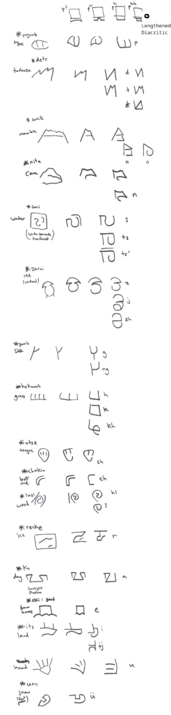 Their alphabetic script was directly inspired by divinations foretelling they would reach outer space. The symbols were directly inspired by the winter landscape since winter is the ideal time for their study.